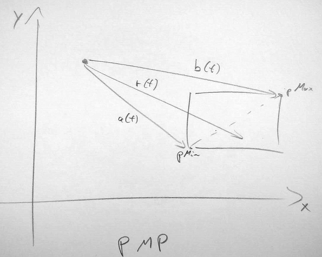 In order to hit a 2D AABB the ray has to pass through it’s diagonal. What diagonal to consider depends on the direction of the ray. Each component of the direction vector is either Zero (O), Positive (P) or Negative (M), thus each ray can be categorized as a combination of $(x,y,z) : x,y,z \in {O,P,M} $. For each type we can derive what diagonal the ray has to pass through in order to hit the box. This diagonal is confined by the vectors $ a,b $, in order to pass through the diagonal, the slope of the ray has to be greater than the slope of $ a $ and less than the slope of $ b $. The slope is defined as $ S_{xy} = {d_x}/{d_y} $. Or if we reverse the logic the ray misses if the folling is true: