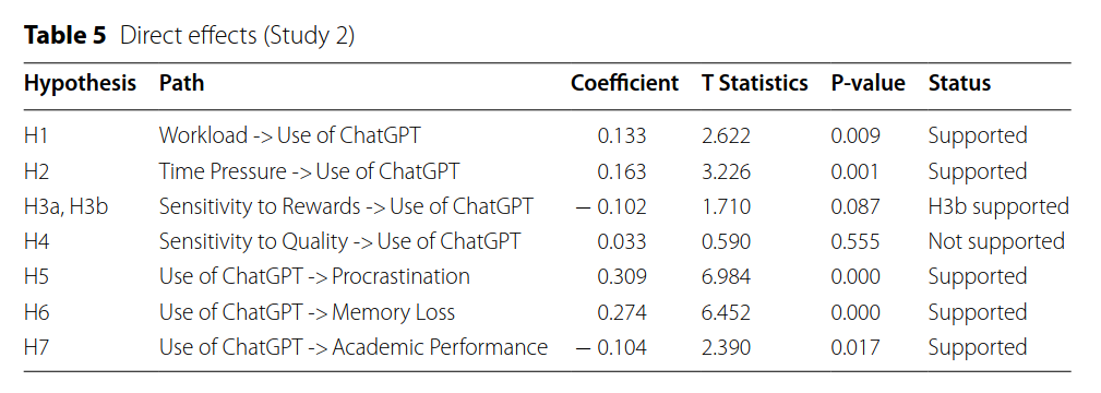They also examined additional hypotheses, such as whether time pressure or high workload increases the likelihood of using ChatGPT, or if its use is correlated with procrastination. These findings might be less surprising, but I found the descriptions of the individual hypotheses quite informative. Below is a list of the hypotheses that have been tested: